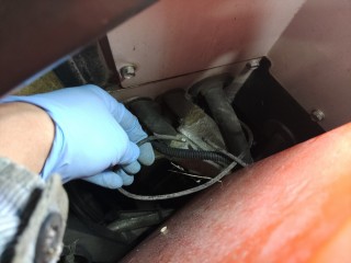 キャブレターに直接混合ガソリンを入れて始動を試みます。